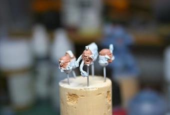 La cabeza de Krom la he sujetado a un corcho con un alfiler para poderla manipular más facilmente. La capa base de la cara está realizada con Tallarn Flesh del Citadel Fundation.