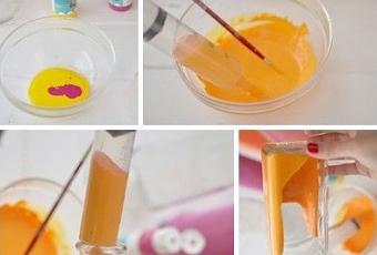 Pintar nuestras botellas será muy sencillo, solamente deberemos elegir qué colores queremos utilizar, rebajarlos con un poquito de agua para que corran mejor dentro de la botella, aunque no demasiada, porque no se fijará a las paredes.