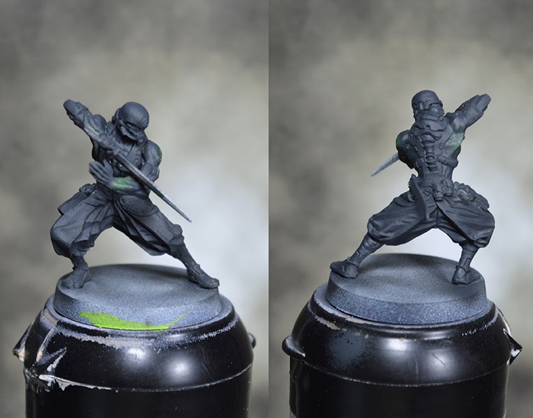 Lo primero de lo primero es imprimar la miniatura en blanco; en blanco ya que la capa base del equipo del Oniwaban va a ser lo primero que pintaremos, y al ser tonos verdes muy claros; conseguiremos el máximo grado de luminosidad imprimando en blanco.