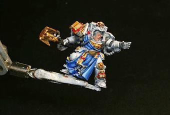 Práticamente lo que queda de su pintura es el libro que porta sobre su generador dorsal pintar su rostro. La pintura del lomo del libro ha sido realizada con Fire Red de Vallejo Model Air, sus dorados los he pintado como siempre he usado Oro Viejo de Vallejo Model Color y las páginas con Blanco Hueso de Vallejo Game Color.