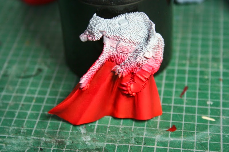 La capa, igual que el resto de la figura ha sido previamente imprimada con Grey Primer de Vallejo. Las sombras de la capa las he pintado con Fenris Grey de Citadel Fundation. Otras veces he empleado el negro para hacer un presombreado pero tenía en gris a mano y he decidido probarlo.