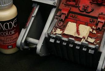 Poco queda ya del pintado del Land Raider. En la entrada anterior del tutorial mostraba como pinté las puertas laterales. Quedaban, por tanto la compuerta delantera. El proceso de pintado es muy similar al otro. Sobre la pintura roja y con el lavado de óleo negro comencé a pintar el enorme libro que tiene. La pintarlo comencé con Blanco hueso de Vallejo Model Color.