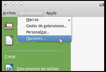 Ahora toca poner ese idioma como predefinido para nuestros documentos. Esto es bastante sencillo, solo tenemos que abrir el Libreoffice y en el menú “Herramientas” ir hasta la opción “Opciones” como podéis ver en la siguiente imagen: