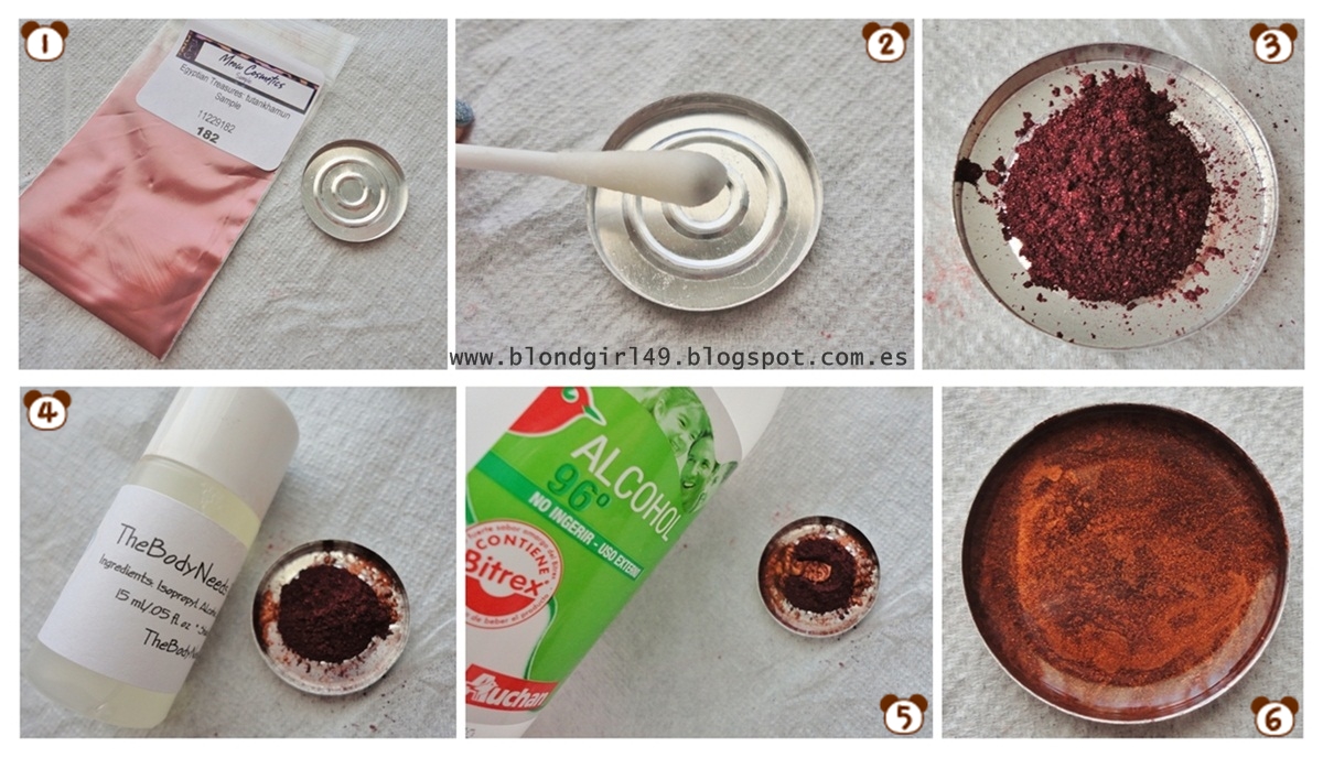 Hoy traigo una entradita que hace tiempo que me estáis pidiendo que os enseñe, pues por fin aquí la traigo! Se trata de enseñaros cómo hago para prensar los pigmentos que compré en la web de Meow Cosmetics de la que os publiqué una entrada inicial sobre cómo me había ido en la compra (aquí podéis verla) pero os haré más entraditas con swatches y looks de maquilllaje^^. De esta entrada también tengo un vídeo pero me ha vuelto a pasar que todavía no se me ha subido a Youtube jajaja soy un desastre :$ pero en cuanto esté lo pondré al final de esta entrada para quien quiera verlo^^Algo muy importante es que uso el Pressing Medium que es un producto similar al alcohol pero con más componentes y ayuda a que con el tiempo no se nos vuelva a quedar la sombra prensada en formato pigmento porque en según que marcas no basta con el alcohol, pasados unos días al meter el pincel se nos deshace toda la sombra... así que mas vale prevenir que curar ¿no?Productos empleados:- Alcohol de unos 96% (la que solemos tener en casa)- Pressing Medium, yo empleé el de The Body Needs (TBN) pero otras marcas lo venden (pero en algunas webs es bastante caro). Si queréis ver las compras que hice y precios en TBN os dejo aquí el enlace.- Pigmentos, yo empleé las muestras que pedí en Meow Cosmetics- Pans de una paleta- Espátula- Palillo para remover- Bastoncito de algodonesEl pigmento que he usado para prensar en esta entrada es:¿preciosa verdad? a mi me tiene enamoradita^^ aunque hay otros pigmentos todavía más impresionantes :)Proceso:1. Preparamos todo lo que vamos a necesitar y elegimos el pigmento que queremos prensar,2. Con el bastoncillo humedecido en alcohol limpiamos el pan que vamos a emplear,3. Con mucho cuidado ponemos el pigmento dentro del pan, he visto que hay gente que lo mezcla en otro envase y luego lo traspasa al pan pero a mi manera de ver se pierde demasiado pigmento (y en las muestras de Meow no es que venga demasiada cantidad :S así que mejor hacerlo de esta manera).4. Removemos el Pressing medium y ponemos varias gotitas (para lo poco que viene en la muestra pongo 2 ó 3, pero para un pan entero pondría 6 ó 7)5. Ahora pondremos más gotitas pero de alcohol (unas 4 ó 5, y si el pan estuviera lleno unas 10)6. Removeremos con el palillo y con mucho cuidado de no volcar el pigmento, tiene que quedar bien humedecida y a lo último golpearemos el pan a la mesa dejándolo caer desde una altura no demasiado significativa para que quede bien planito y se vayan las burbujas (aunque aún así alguna burbuja acaba quedando ¬¬). Luego la dejaremos secar durante varias horas (mínimo 5) pero también tenéis la opción de darle con el secador de cabello pero id con cuidado con la potencia porque el pigmento aunque esté húmedo se os puede derramar. Yo algunos los dejé secar al aire libre y otros con el secador, el resultado ha sido bastante indiferente jeje queda bien de las dos maneras :)Y finalmente nos queda así la sombra:Puntos a destacar:- Una pregunta que muchas me habéis hecho ¿pierde pigmentación al prensarla? Pues no, no pierde nada de pigmentación! todo lo contrario tiene mucha más pigmentación gracias al Pressing Medium que la deja como en un formato algo cremosito o mousse, yo he usado las sombras incluso sin prebase y pigmentan de maravilla (pero sin prebase si lleva brillitos no se quedan demasiado en el párpado por eso mejor usar siempre prebase). El swatche de la foto de arriba está hecho metiendo el dedo en el pan directamente :)- Algo que os puede sorprender al prensar los pigmentos es que al mojarlos les puede cambiar el color, pero que no cunda el pánico al secarse vuelve a su color. Y otras veces no cogen exactamente el mismo color que en la bolsita pero luego al aplicarla en los ojos sí que la tonalidad es la misma que en un principio.- Si lleva brillitos a veces quedan mas concentrados en un lado que en otro pero tampoco es algo que pase mucho, yo lo he notado mas porque al haber poco pigmento es más fácil que se separe un poco más pero con el pan lleno eso no pasa (al menos no es notorio, yo lo he probado y se nota la diferencia).- Como veis mis sombritas han quedado bastante pobres pero al no haber más pigmento es lo que hay... y eso que he usado pans de 26mm menos mal que lo había pensado con anterioridad y no cogí los de 36mm jajaja- ¿Ha funcionado el pressing medium? pues a mi por el momento me han quedado bien prensadas y cuando paso el pincelito no se me deshacen, supongo que en parte es por el pressing así que sólo tengo buenas palabras.También os dejo el vídeo que no es demasiado largo y sale bien todo el proceso que os he contado arriba^^**CUANDO ESTÉ SUBIDO OS LO ADJUNTO**Espero que os haya servido la explicación del proceso^^, ya sabéis que a mi todo lo que sean "manualidades" me encantan así que disfruto como una niña pequeña prensando pigmentos jajajaja¡Besitos y feliz miércoles!