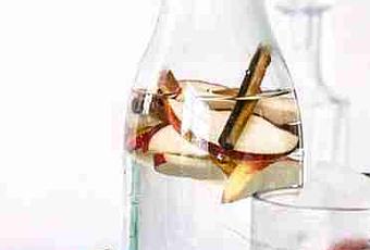 Cuando esté caliente, viértela en una jarra y añade las varitas de canela y las manzanas verdes cortadas en trozos finos.