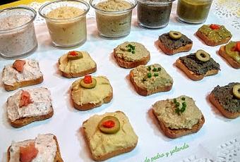 Entrantes: Nuestros amigos Pedro y Yolanda nos ofrecen un surtido de canapés de hummus, tapenade, patés caseros y guacamole que están para chuparse los dedos.