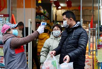Un trabajador mide la temperatura corporal de las personas que salen de un supermercado en el distrito de Qingshan de Wuhan, China, 7 de febrero de 2020.