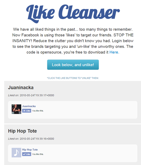 Pero os traemos otra opción mucho más sencilla y rápida. Se trata de utilizar Like Cleanser, una herramienta gratuita que conectándose a tu cuenta, te devuelve en un formato lista todos los “me gusta” que tienes en la actualidad. Además Like Cleanser es una aplicación opensource y puedes consultar aquí su código fuente.