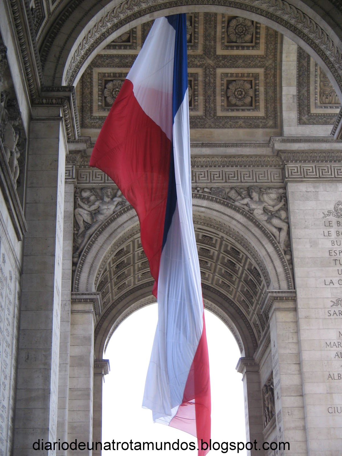 1) Si uno se para en la Avenue des Champs Elysées, debajo del arco del triunfo (Tip de viaje: se cruza por un puente subterráneo) podrá ver, de un lado y a lo lejos, la Défense (el barrio moderno, donde se concentra el sector financiero, marcado por el emblemático edificio llamado "El Gran Arco" (Le Grande Arche de la Défense), y del otro, Place de la Concorde, los Jardines de Tuillerías, y el Museo del Louvre. Es por ello que los desfiles del 14 de Julio (Dia del aniversario de la Toma de la Bastilla) comienzan en la Défense, son coordinados desde la terraza del Arco del Triunfo, y culminan en Place de la Concorde (que es donde se instalan los palcos oficiales, donde se ubican las autoridades).