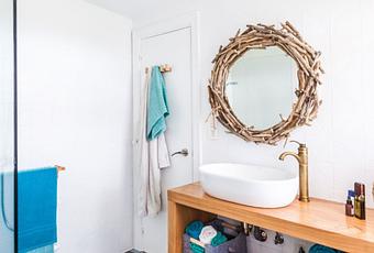 Para terminar de decorar este baño luminoso instalaremos una mampara de cristal transparente, y otros complementos de decoración y elementos naturales que el aportarán el estilo playero que buscamos.