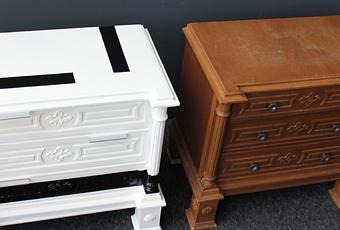 En primer lugar se deben retirar los tiradores, para proceder a lijar el mueble. Una vez lijado, procederemos a darle una primera capa de imprimación, con el fin de preparar la superficie para el posterior pintado. Tras esto, ya podemos proceder a pintar de blanco el mueble.