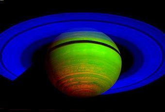Esta imagen compuesta en falso color, fue realizada a partir de datos obtenidos por Cassini, la imagen muestra los anillos de Saturno y el hemisferio sur. La imagen fue elaborada a partir de 65 observaciones individuales realizada mediante el espectrómetro visual infrarrojo de imagen VIMS de Cassini en la banda la porción del infrarrojo cercano del espectro de luz el 1 de noviembre de 2008. Las observaciones tuvieron cada una seis minutos de duración. Crédito: NASA / JPL / Universidad de Arizona y la Universidad de Leicester