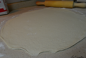 Pasado el tiempo sacamos la masa del bol con mucho mimo, volvemos a ponerla sobre la encimera y con los nudillos de las manos sacamos el aire sobrante ligeramente. Volvemos a meterla en el bol, introducimos al horno bien tapada y dejamos reposar otros 15 minutos. Una vez pasados los minutos restantes ya podemos estirar nuestra masa de pizza con ayuda de un rodillo, la estiraremos muy muy fina ( tened en cuenta que luego subirá algo en el horno ).