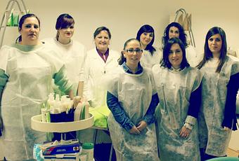 Cuando llegamos, nos dividieron en dos grupos de 4, uno realizó una crema corporal paso a paso y el otro visitó las instalaciones. Cuando terminamos, justo al revés. Para mantener la mayor higiene posible, nos pusimos una bata, un gorro, una mascarilla y unos guantes ¡Miradnos!