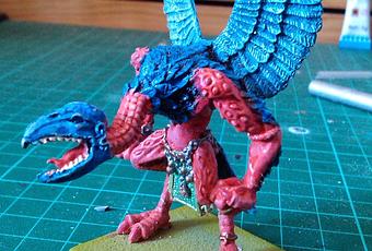 Y acabé la figura eligiendo el color de los cañotes (la pluma cuando todavía está saliendo, uno no vive con loros sin aprender un poco de jerga pajaril) que tiene a lo largo de brazos y piernas, estuve pensando en pintarlos como piedra de disformidad incrustada, pero parecía muy skaven. Al fin me decidí por usar los mismos colores que las plumas intermedias de las alas.