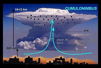 El granizo, una de las formas de precipitación que acompaña a las tormentas, se produce en las nubes de tipo cumulonimbus. Estas son nubes de fuerte desarrollo vertical que pueden alcanzar gran altura (por encima de los 15 Km) y de cima plana. Dentro de la nube, hay violentas corrientes ascendentes que elevan las gotas de agua hasta una altura en la que la temperatura es muy fría, entonces el agua se congela formando bolas de hielo. Cuando estas bolas adquieren un determinado peso caen chocando con otras gotas de agua que se congelan sobre ellas, aumentando así su tamaño. Estas bolas de hielo pueden ser arrastradas de nuevo hacia arriba por las fuertes corrientes ascendentes. En este bajar y subir dentro de la nube (pueden hacer varios viajes, incluso superar la veintena), la bola de hielo va adquiriendo más tamaño hasta que llega un momento que su peso impide que pueda ser empujada hacia arriba de nuevo y acaba cayendo a la tierra.