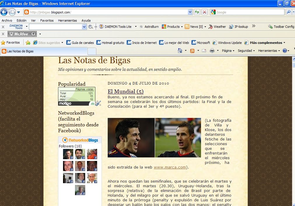 2) Desde Facebook. Mis amigos de Facebook pueden utilizar una aplicación dentro de Facebook llamada NetworkedBlogs. Identificando mi blog como uno de los que queréis seguir, podréis acceder directamente en Facebook desde Cuenta>Aplicaciones>NetworkedBlogs a las actualizaciones que haya habido en mi blog. Arriba a la izquierda de la página de mi blog están identificados los seguidores por este método (diez en este momento, incluyéndome a mi mismo).
