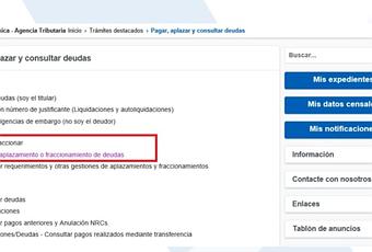 A continuación clicaremos en el trámite de "Solicitar aplazamiento o fraccionamiento de deudas", situado en el apartado "Trámites destacados" y una vez dentro en la opción "Pagar, aplazar y consultar deudas".