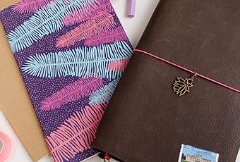 El modelo de Traveler’s Notebook que aparece en la imagen es el marrón en tamaño Regular Wide. Los cuadernos son Moleskine Cahier Large forrados con papeles decorativos.