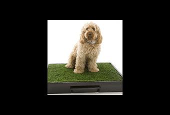Necesitarás una caja de plástico grande para que sirva como caja de arena para tu perro. Hay muchos modelos en el mercado con diferentes características, incluyendo las cubiertas con un filtro que atrapa el olor, con funciones de auto-limpieza, con forma de iglú, y cajas con varias capas que tienen una reja o una capa de hierba en la parte superior y permite que los residuos se acumulen en una bandeja inferior. Pero no olvides que la caja debe ser lo suficientemente grande para que tu perro dé la vuelta con comodidad. La arena para la caja del perro es similar a la variedad para los gatos y hay muchos tipos, desde bolitas de papel con control de olores mediante el uso carbón activado, a simples arenas de arcilla. Para el control del olor, espolvorea bicarbonato de sodio en el fondo de la caja cada vez que la vacíes.