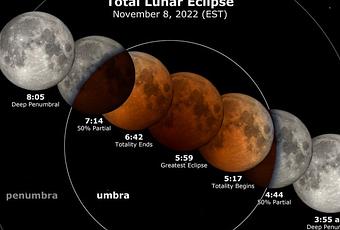El eclipse lunar del 8 de noviembre de 2022 durará varias horas, y el eclipse parcial durará aproximadamente una hora cerca del momento de máxima totalidad de una llamada (por el color) ‘Luna de sangre’ de 85 minutos de duración.