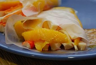 6. Mojar las obleas de arroz en agua para que se vuelvan maleables. Colocarlas sobre un papel de cocina y rellenarlas con las tiras de mango, cebollino, pimiento y palito de cangrejo. Envolver.