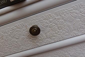 Pero lo más bonito de todo para mí son los cajones,después de tenerla toda pintada de blanco,elegí un stencil qué me recuerda a una tela brocada y con estuco fui haciendo el relieve