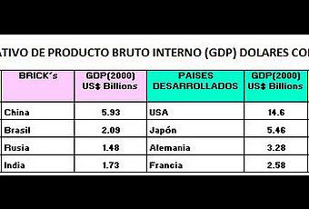 Los países desarrollados como EE.UU, Japón, Alemania y Francia, están siendo alcanzados por otros países considerados emergentes, que bien no poseen una distribución adecuada de su riqueza, pero en términos brutos, su producción está cercana a la de los mas desarrollados.La República Popular de China, es ya la segunda economía mundial, de hecho ha sobrepasado de lejos a la suma de Alemania + Francia + Reino Unido (3,28+2,58+2,47) Billones de US Dólares a precios corrientes del año 2000. Con una población superior a los 1.330 millones de habitantes; la República Popular de China se ha convertido en el motor de la economía asiática y con crecientes intereses en África y en América Latina. Brasil, el gigante de Sudamerica está creciendo de tal modo que su producción bruta alcanzará y sobrepasará a la de Francia y al Reino Unido hacia el 2016 (ver información del IMF, adjunto enlace: http://www.imf.org/external/pubs/ft/weo/2011/01/weodata/weorept.aspx?pr.x=38&pr.y=12&sy=2009&ey=2016&scsm=1&ssd=1&sort=country&ds=.&br=1&c=512%2C941%2C914%2C446%2C612%2C666%2C614%2C668%2C311%2C672%2C213%2C946%2C911%2C137%2C193%2C962%2C122%2C674%2C912%2C676%2C313%2C548%2C419%2C556%2C513%2C678%2C316%2C181%2C913%2C682%2C124%2C684%2C339%2C273%2C638%2C921%2C514%2C948%2C218%2C943%2C963%2C686%2C616%2C688%2C223%2C518%2C516%2C728%2C918%2C558%2C748%2C138%2C618%2C196%2C522%2C278&s=NGDP_RPCH%2CNGDPD%2CNGDPDPC%2CPPPGDP%2CPPPPC&grp=0&a)Rusia se proyecta como uno de los países con mayor crecimiento y avances tecnológicos en el este europeo, La India, es otro de los grandes países con una economía que supera los 1,73 Billones de U$ Dólares, con mas de 1.150 millones de habitantes se convierte en un gran demandante de materia prima y otros productos.Entre los países emergentes que están igualmente creciendo está México y Turquía. Ambos países con desiguales distribuciones de sus ingresos, se han convertido en grandes demandantes de energía para sustentar su producción.¿Es la Población determinante para el crecimiento de estos países?Los países del grupo BRIC, han tenido altas tasas de natalidad y de inmigración, ahora los tamaños poblacionales son:China ------------------ 1.336 Millones de Hab.India ------------------- 1.189 Millones de Hab.Brasil ------------------- 203 Millones de Hab.Rusia ------------------- 140 Millones de Hab.Pero México tiene sólamente 113 Millones de Habitantes y genera mas de 1 Billón de U$ Dólares en el 2010, Alemania posee sólamente 81 Millones de Habitantes y produce mas de 3,28 Billones de U$ Dólares; entonces podemos decir que no hay evidencia real a favor de que una numerosa población pueda contribuir a mejorar y aumentar la producción bruta de un país, por el contrario el factor que si influye en estos es la Tecnología (en su versión I + D).El mundo está cambiando y definitivamente las condiciones del mercado internacional y de los nuevos mercados demandantes van a imprimir inclusive sus gustos y preferencias en la demanda mundial de bienes y servicios, situación a la cual debemos como países emergentes latinos, prepararnos. http://data.worldbank.org/data-catalog/