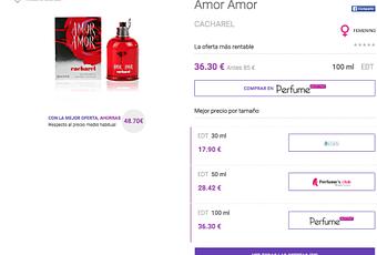 Primero os enseña los mejores resultados, y no solo por precio, sino comparando precio/mililitros, luego si os creáis la cuenta os enseña incluso más resultados: