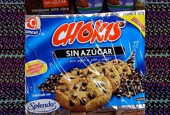Chokis sin azúcarIngredientes:Harina de trigo, chispas sabor chocolate (manteca de cacao, pasta de cacao, carbonato de calcio, caseinato de calcio, grasa de leche, lecitina de soya, saborizante), grasa vegetal emulsificada, isomalt, polidextrosa, suero de leche en polvo, harina de avena, malitol, sal yodada, saborizante, hierro, vitamina B12 y ácido fólico, sucralosa, acesulfame k.