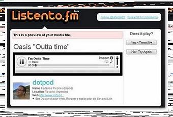 ListenTo.fm es un servicio de música online gratis que te permite compartir cualquier tipo de música, ya sea formato de audio o vídeo musical en Twitter. Para ello simplemente deberás introducir tu nombre de usuario de Twitter y algunos campos de información sobre la canción que estas o deseas compartir, como el título y el grupo que interpreta la canción.