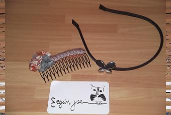 Estos son los dos complementos que tengo para el pelo que me parecen preciosos, muy originales y supercomodos.La diadema esta forrada en de raso negro y lleva un detalle en forma de mariposa metalizada y la peineta es de color beige decorada con motivos florales en colores tostados y naranjas para resaltar en el cabello.