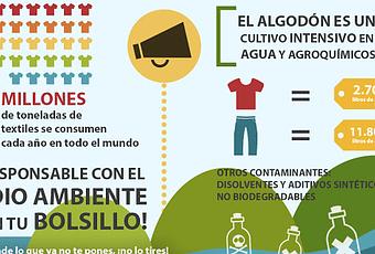 Uno de los materiales más usados en la confección textil es el algodón, un recurso natural que necesita un cultivo intensivo en el uso de agua y agroquímicos. WWF España alerta que para fabricar una camiseta de 250 gramos se necesitan 2.700 litros de agua, mientras para unos vaqueros de un kilo se destinan más de 11.800. Sin embargo, existen otros elementos contaminantes que se utilizan durante el proceso de preparación de las fibras, como los disolventes o los aditivos sintéticos no biodegradables, los cuales pueden acabar vertidos en ríos y dañar los ecosistemas naturales.