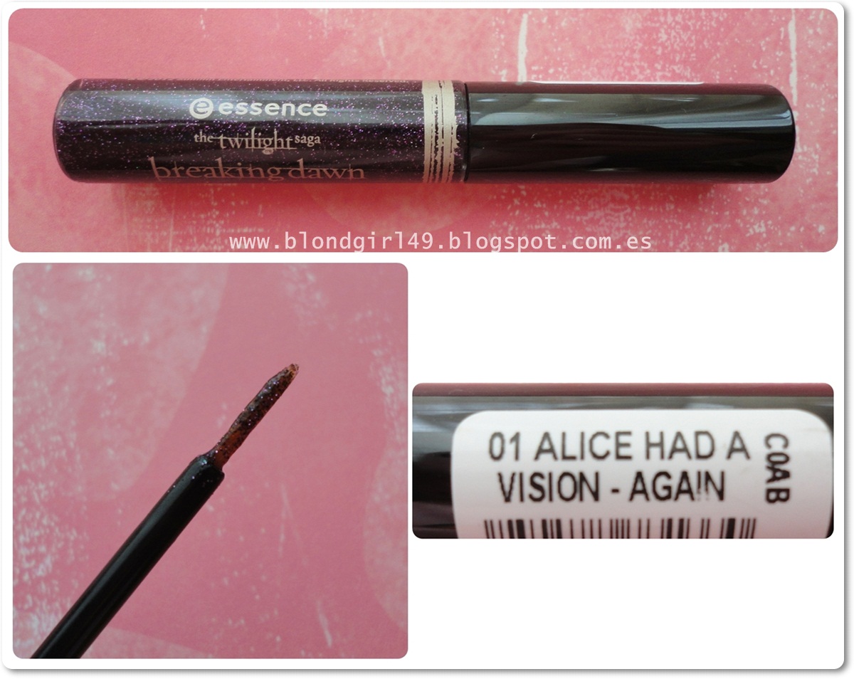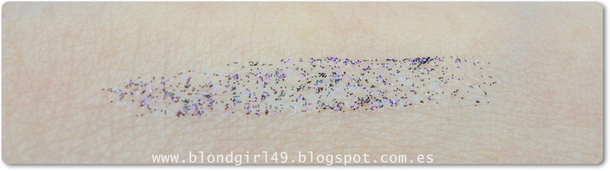 Este es el nº01 Alice had a vision-again, en el tubito vemos que es moradito con bastantes glitters. El aplicador es bastante finito de pelos, va bien por lo fino que es pero los pelos se doblan con demasiada facilidad (al menos para mi gusto). Pensaba que tendría algo de pigmentación pero en realidad es transparente con los glitters moraditos. Abajo podéis ver el swatche.La verdad es que me ha decepcionado porque hay que insistir mucho para que el pincel coja bastante cantidad de glitters, pero bueno se puede ir usando para looks de noche^^Contiene 4ml, dura 6 meses y su precio fue de 2,99€
