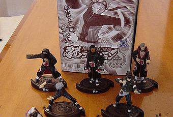 La primera colección de figuras de Naruto Shippuuden están basadas en el periodo en que los ninjas de Konoha lucha contra Hidan y Kakuzu. La colección la componen 8 personajes : Naruto, Sasuke, Shikamaru, Kakashi, Asuma, Kakuzu, Hidan y Tobi.Compre una caja completa de 10 figuras (2300 yens) donde venia la colección entera mas 2 figuras repetidas que se las di a un amigo.