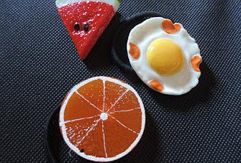Lo primero que he recibido estos días son 2 coleteros y un clic con formas divertidas: un huevo frito, una rodaja de naranja y una de sandia.