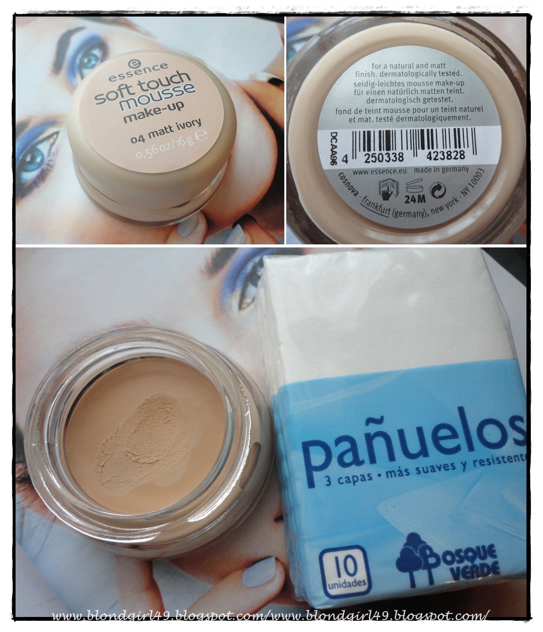 Soft Touch mousse de EssenceComo ya sabréis muchas es un maquillaje en formato mousse, es bastante famoso y precisamente por eso me animé a probarlo. Yo me pusetodos los tonos en la mano y la 04 Matt Ivory es la que mejor se fundía con mi tono de piel, parece algo oscura pero una vez que la esparcimos se me quedaba con mi tono blanquecino.Me gustaría dedicarle una entrada por lo que no me extiendo mucho, pero ya os digo que me gusta mucho aunque también tiene sus contras y el más significativo para mi es que no lleva demasiado producto por lo que no cunde tanto que un bote de maquillaje. El tamaño lo podéis ver comparado con un paquete de pañuelos.Lleva 16gr y su precio es de 3,99€