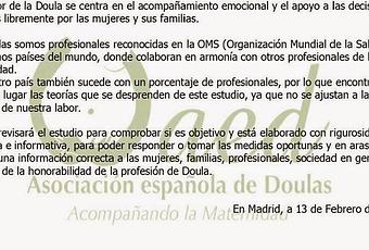Desde la AED, Asociación Española de Doulas, queremos dejar clara nuestra postura ante las últimas informaciones referentes a nuestra profesión y un informe acerca de ella que parece se publicará en breve. Llamamos a la coherencia y la información contrastada en favor de la maternidad