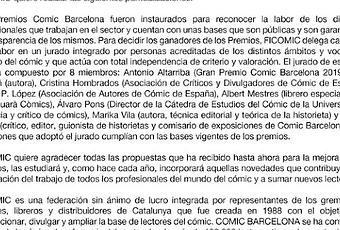 -Los Premios COMIC Barcelona fueron instaurados para reconocer la labor de los distintos profesionales que trabajan en el sector y cuentan con unas bases que son públicas y son garantes de la transparencia de los mismos. Para decidir los ganadores de los Premios, FICOMIC delega cada año esta labor en un jurado integrado por personas acreditadas de los distintos ámbitos y voces del mundo del cómic y que actúa con total independencia de criterio y valoración. El jurado de este año estaba compuesto por 8 miembros: Antonio Altarriba (Gran Premio Comic Barcelona 2019), Ana Galvañ (autora), Cristina Hombrados (Asociación de Críticos y Divulgadores de Cómic de España), Ulises P. López (Asociación de Autores de Cómic de España), Albert Mestres (librero especializado, Continuarà Còmics), Álvaro Pons (Director de la Cátedra de Estudios del Cómic de la Universitat de València y crítico de cómics), Marika Vila (autora, técnica editorial y teórica de la historieta) y Antoni Guiral (crítico, editor, guionista de historietas y comisario de exposiciones de Comic Barcelona). Las decisiones que adoptó el jurado cumplían con las bases vigentes de los premios.
