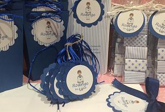 Etiquetas con ondas, recordatorio estampita comunión en raya azul y decorado en azul