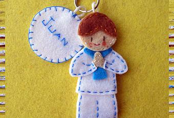 He hecho niños comulgadores en formato llaverito y formato marcapáginas de unos 7 cm., ambos con unos circulitos donde poder grabar el nombre y la fecha de la comunión. Si alguien está interesado en tener su propio ejemplar, tendrá que pedírmelo y se lo hago rápidamente.