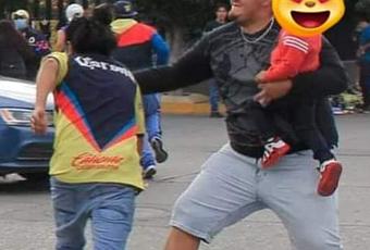 En ese preciso momento, un hombre con un bebé en brazo, de forma irresponsable, interviene en el conflicto y mete una zancadilla a un aficionado del América. Además y aún con el bebé en brazos, interviene en la golpiza por un momento sin importarle la integridad del menor para posteriormente huir del lugar.