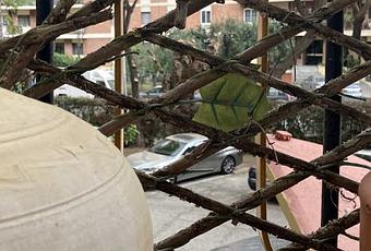 En una de nuestras terrazas teníamos puesta una celosía de madera con hojas artificiales, pero los años y las inclemencias del tiempo hicieron necesario cambiarlas. Al retirarlas, fue que visualizamos algunos de esos palitos reconvertidos en una idea que nos rondaba y que pensábamos hacer efectiva en cuanto pudiéramos salir de la ciudad... Pero, de nuevo, la misma ciudad nos brinda recursos inesperados...
