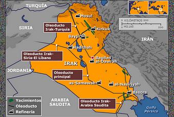 El mapa de arriba corresponde a los campos petrolíferos de Irak. No es difícil imaginar que ante una visión tan celestial como es la de cientos de millones de dólares al día en ‘oro negro’ uno estuviese dispuesto a apoyar cualquier tipo de guerra en Irak o en la Conchinchina. Cuando George W. Bush hizo su particular tour en busca de apoyos a su invasión del país árabe en Reino Unido, Tony Blair, le acogiese con los brazos abiertos.
