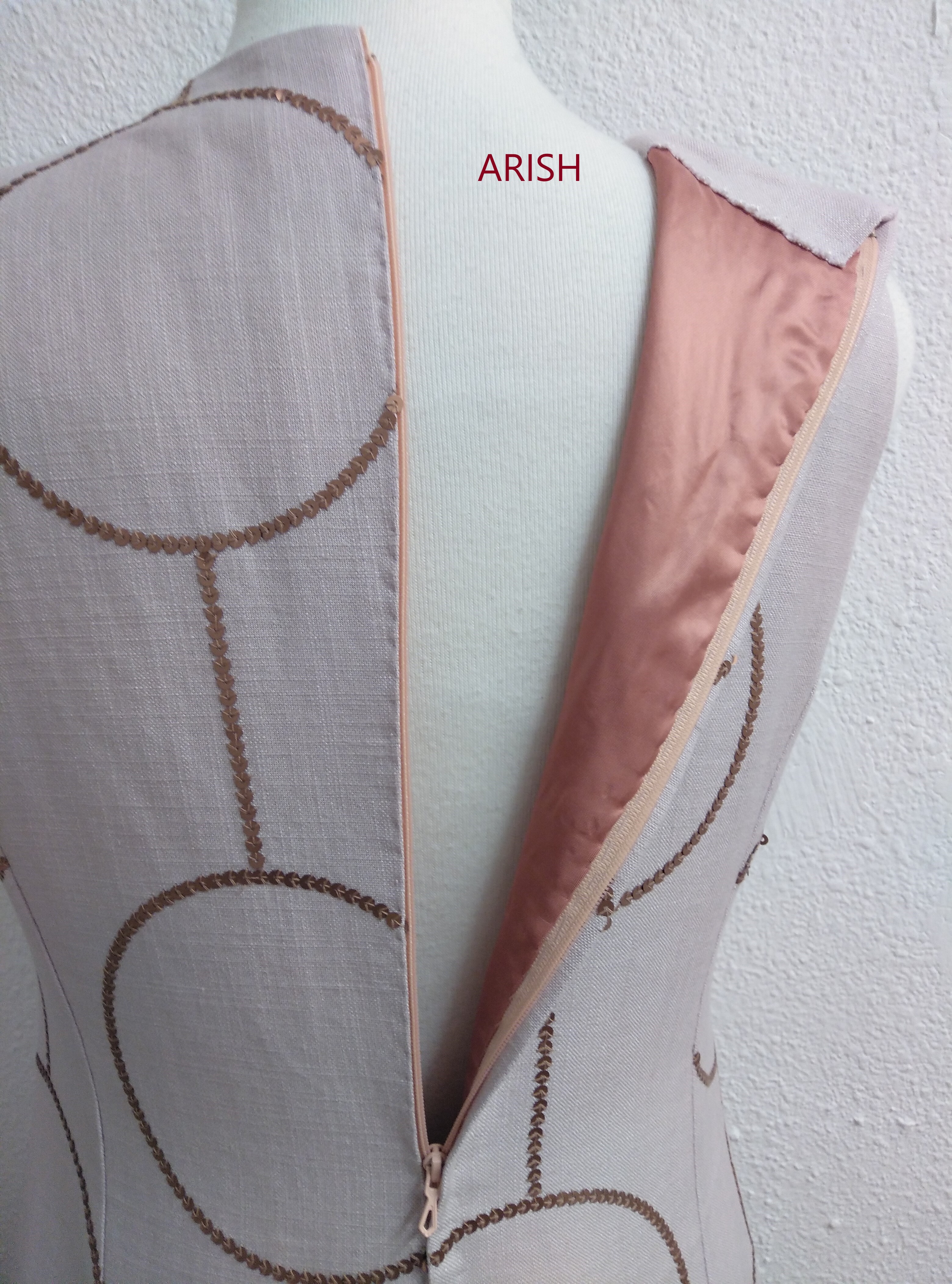 Lino de algodón en color rosa antiguo con bordado de lentejuelas en color cobre