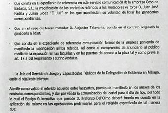 Con este escrito, Catalina Gómez Ordóñez, jefa del servicio de juegos y espectáculos de la Junta de Andalucía, da el visto bueno a la celebración de la corrida de esta tarde en La Malagueta tras modificarse y adjudicar a cada torero sus dos toros sin que exista sorteo.