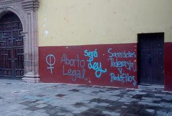 Con mensajes en pintura azul como: «Aborto Legal», «Será Ley»,«Anti Derechos» y «Sacerdotes Pederastas y Pedófilos»; fue como amaneció este templo religioso .