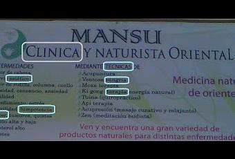 Como se ve en la foto, se trata de un cartel publicitario de una clínica de medicina natural. Esperemos que la medicina se les dé bien, porque lo que es la ortografía... Han escrito clínica, cáncer, técnicas y sangría sin tilde. Han escrito terapia con tilde. Pero esto no es lo más grave. Lo peor es que han escrito himpotencia, sí, con H, y, por si fuera poco, se han inventado una nueva parte del cuerpo humano, el nervio asiático, que tanto Ale como yo imaginamos que lo han confundido con el nervio ciático.