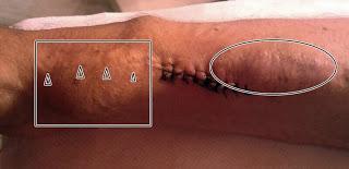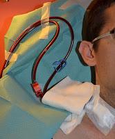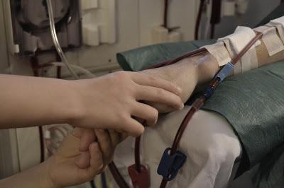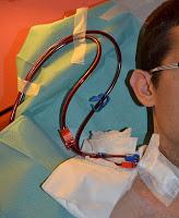 ![]() Autora de la imagen: Lola Montalvo Esta vez no voy a contar una historia inventada basada en algo real.Esta vez la historia es completamente real... sucedió el día 27 de abril. Esa mano conectada a las líneas arterial y venosa de un sistema de hemodiálisis pertenece a la persona a la que cuido y a la que le ayudo a dializarse 5 días por semana. Las otras dos manitas son de dos pequeños ayudantes. Regresando de hacer deporte, él se golpeó con el vano de una puerta justo en la fístula que tiene en la muñeca derecha. Siempre se comprueba si tras un incidente de este tipo todo sigue bien, buscando el latido y el soplo que el flujo de sangre realiza a su paso por esta vía. Pero ese día iba con prisa y no lo hizo hasta esa misma tarde, en la que comprobó con estupor que no le funcionaba, que no tenía latido. Le ausculté con el fonendo y, efectivamente, la fístula no latía, es decir, había perdido el flujo arterial, ése que le da un volumen de sangre mayor y que permite extraer unos volúmenes por minuto de entre 300 y 400 ml, en este caso. Fuimos a urgencias y, como no podía ser de otra forma, le cogieron un catéter en el cuello, uno de dos vías para que yo pudiera seguir dializándole en casa. ![]() ![]() A los pocos días, le intervinieron para realizarle una nueva fístula. Como existía esa posibilidad, aprovecharon el tramo de la fístula anterior: le realizaron una anastomosis arteriovenosa cogiendo una rama arterial cercana que le permitió aprovechar la dilatación venosa de la anterior fístula, lo veis en la foto de abajo: ![]() Autora de la imagen: Lola Montalvo El cuadrado recoge la intervención inicial arteriovenosa, la cicatriz vieja y el abultamiento de la varicosidad que se le había trombosado por el golpe sufrido. Los puntos, por supuesto, son los de la nueva intervención que, como veis en el óvalo blanco, se ha hecho aprovechando el recorrido varicoso de la fístula anterior. ¿Qué permite esto? Pues que se le pueda pinchar las líneas arteriales y venosas a la semana de realizar la intervención, porque no hay que esperar a que el flujo arterial dilate el vaso venoso para que pueda proporcionar un flujo adecuado para una sesión de hemodiálisis. Si hubiera sido una fístula nueva, habría tenido que esperar entre dos y tres meses para poder pinchar en ella, porque es lo que tarda en «madurar» una fístula.¿Qué es una FAVI? Quizá tendría que haber comenzado por este punto antes de narrar todo lo demás, pero necesitaba dar importancia al hecho del accidente en sí, algo que a cualquier paciente de ERC con fístula le puede suceder... ellos lo saben bien ¿verdad? ![]() Imagen perteneciente a e-mergencia.com La FAVI o Fístula Arterio-Venosa Interna puede verse en el dibujo. Es la unión quirúrgica o anastomosis entre una arteria y una vena. Lo que se consigue es que la sangre arterial, como tiene mucha más presión por el impulso cardíaco que la sangre venosa, pasa parte de su flujo a la vena; los vasos venosos tienen paredes menos musculosas y con menos tono. Con el tiempo, unas semanas o meses, el impulso de esa sangre arterial sobre las paredes de la vena van produciendo una dilatación de ese vaso, como ocurre en las varices, pero con pulso, porque la sangre arterial que pasa a esa vena entra con la fuerza producida del latido. Llegado a un punto, esa vena estará dilatada y con suficiente flujo de sangre como para soportar la extracción en cada sesión de hemodiálisis de un volumen mínimo de 300 ml/minuto y una entrada por la vía de retorno de un volumen similar (algo menor)¿Cuáles son los cuidados de la FAVI? Ante todo y visto lo que he explicado más arriba, la FAVI hay que protegerla de todo tipo de golpes/agresiones. Los cuidados básicos son (tomado y ampliado de Enfermería y Cuidados):