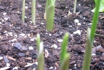 Los ajos, que parecían pacíficos, empiezan a emerger de las profundidades de la tierra…Ya nacen agrupados, para ser más fuertes, aunque se ve claramente que hay un líder que domina toda la franja del ajo.